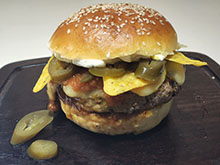 Pão brioche, carne 180g, queijo cheddar, molho picante, jalapenhos, molho BBQ